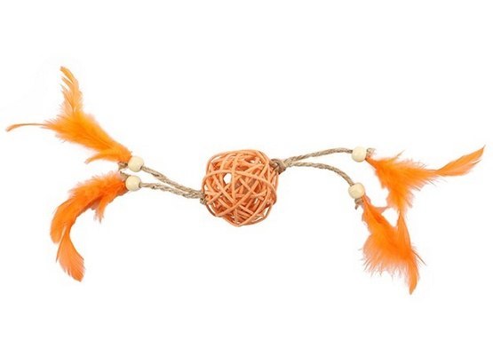 Zabawka dla kotów w kształcie piłeczki, wykonana z wikliny, naturalnych sznurków, drewnianych koralików oraz piór. Zawiera dzwoneczek. Wymiary: 15,5 x 5 x 5cm