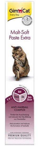 Pasta Malt-Soft Extra zawiera jedyny w swoim rodzaju, podwójnie skuteczny komplek Anti Hairball. Kombinacja ekstraktu słodowego, wysokiej jakości olejów i błonnika wspomaga naturalne wydalanie połknietych włosów, a tym samym zapobiega powstawaniu nowych kul włosowych. Dodatkowo zapobiega również zaburzeniom trawienia wywołanym przez kule włosowe, a zawarty w paście betaglukan skutecznie przeciwdziała występowaniu stanów zapalnych w układzie pokarmowym.